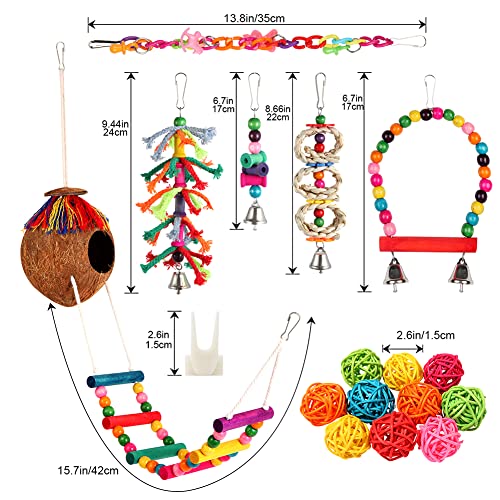 FOR VARIOUS BIRDS:All parakeet toys include an lively hook which might simply attaches to the highest of the fowl cage,saving area and a very good ornament of the fowl cage.Nice for both small or medium birds like parakeets,cockatiels,conures,macaws,parrots,love birds,Mynahs,finches,pineapples ect.Good reward in your fowl mates.