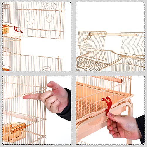 【Pet-parent friendly & Safe】: Bird cage with a button lock on the front door can keep your smart birdies safe in a cage while the lock design is very easy for pet parents to operate. You can easily lift and move the cage by holding the two handles on top. Each front door has two small entrances, which are specially designed for your little friends. The panels feature 8 feeding doors for easy seed and water refilling.