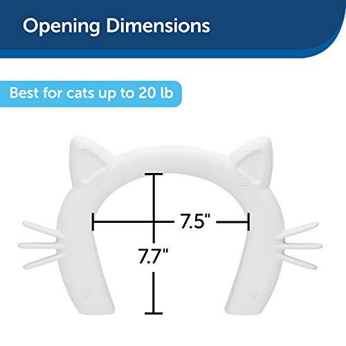 CAT DOOR DIMENSIONS: The cat door opening measures 7 1/2 in W X 7 11/16 in H; greatest for cats weighing as much as 20 lb