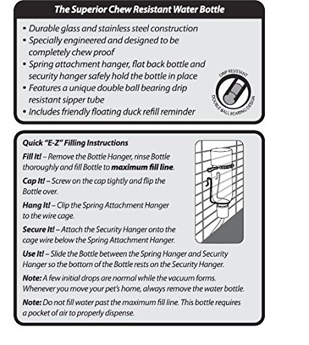 Superior chew resistant water bottle. Glass and chrome steel design. Spring attachment hanger holds bottle securely in place inside or exterior any small animal wire residence. Options distinctive double-ball bearing drip resistant sipper tube. Stainless-steel cap and floating duck reminder included.