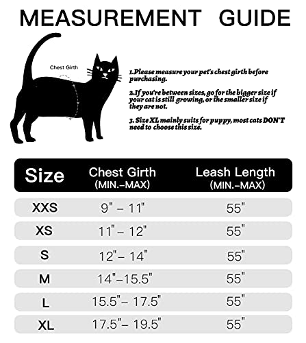 【Cat Leash and Harness Set】: SIZE XXS matches [Chest Girth: 9 – 11 Inches], Sizing does NOT immediately correspond to your pet’s breed or weight. PLEASE ACCURATELY MEASURE your cat and confer with the SIZE GUIDE earlier than buy.