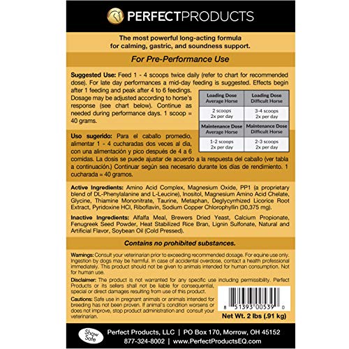 Excellent ProductsThe energy of Gold Paste in an easy-to feed pellet Consists of Perfequin for a sounder horseIncludes GastroEase to handle GI stressEffects start instantly and peak after 4 to six feedingsMay be used alone or together with any Excellent Prep formulaContains NO PROHIBITED SUBSTANCES2lbPPGPEL2 The world’s strongest and moral present protected calming method in a handy feed-through pellet. Now supplies 30% extra calming impact, incorporates added pre-event soreness assist and added gastric soothers for much more full present prep.Consider every particular person horse’s response to this product previous to efficiency. Feed based on under chart with AM and PM feed, with a feeding 4 hours previous to occasion.For late day performances a mid-day feeding is usually recommended. Results start after 1 feeding and peak after 4 to six feedings. Proceed as wanted throughout efficiency days. 1 scoop = 40 grams. 1 scoop is taken into account 1 dose. Suggestions for Finest Outcomes For max impact, the final feeding of Gold pellets ought to fall 4 hours previous to efficiency time. (Pre-event lunch feeding is usually recommended.) Lively Components: Amino Acid Advanced, Magnesium, DL-Phenylalanine, L-Leucine, Inositol, Thiamin, Riboflavin, Pyridoxine HCL, Glycine, Taurine, Metaphan, Deglycyrrhized Licorice, Sodium Copper Chlorophyllin