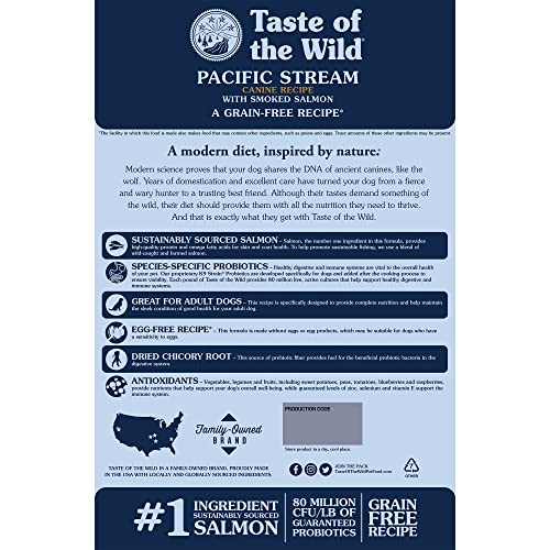 Taste of the Wild Pacific Stream with SMOKED SALMON dry dog food; REAL FISH is the #1 ingredient; high protein (32%) to help support bones, joints and LEAN, STRONG MUSCLES