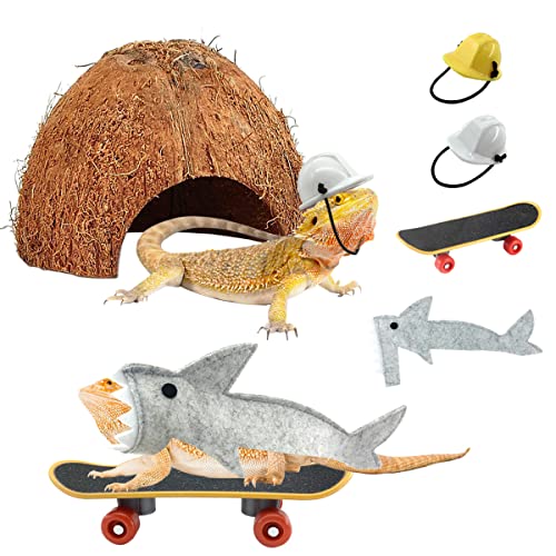 【5pcs in a single bundle】1x lizard coconut shell dome hideout, 2x mini constructing employee hats, 1x bearded dragon shark costume and 1x mini scooter for beardie.