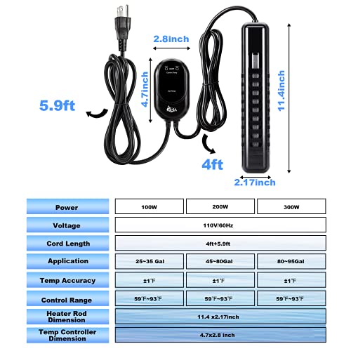 🔥【Temperatures Ranges 59℉ to 93℉,Automatic Heating】The heating rod built-in thermometer,When the water temperature is lower than the set temperature by 1℉, the heater will automatically heat up, and stop heating when the water temperature is consistent with the set temperature.Fahrenheit and Celsius can be converted to each other,Pressing and holding for 5 seconds changes temperature display from Celsius to Fahrenheit.