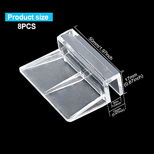 Rimless Tank Cowl Clips Internal Width: 0.24inch(6mm),dimension (L x W x H): 2.2 x 1.53 x 0.7inch/5.5×3.9×1.8cm,match for glass high is about 0.2-0.24inch(5-6mm) thick.