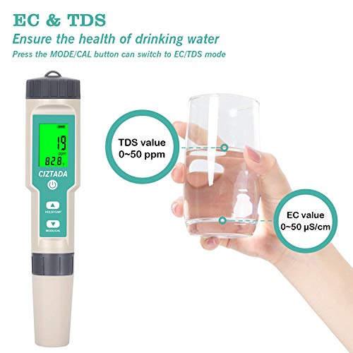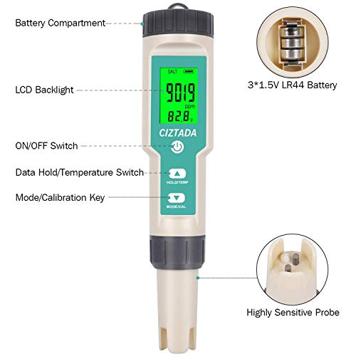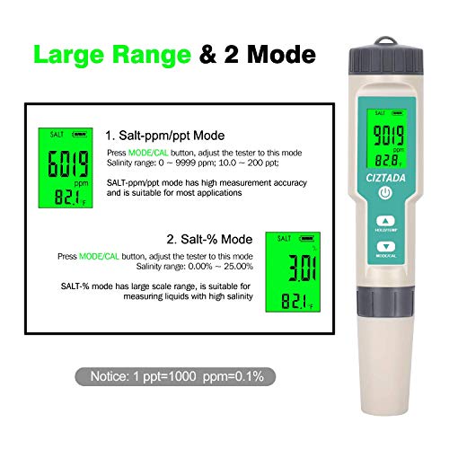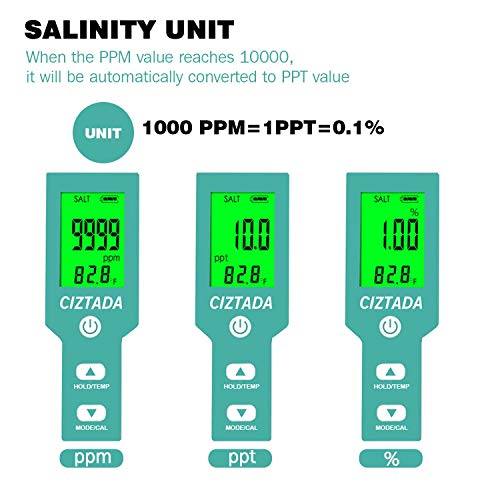 [Multifunctional Salinity tester]: The Ciztada multi-parameter Tester can take a look at Salinity, TDS, EC and Temperature in an correct, fast and dependable method for many common water options’ testing. Assist One-tap change from salinity to TDS/EC