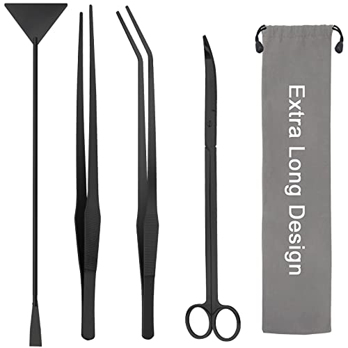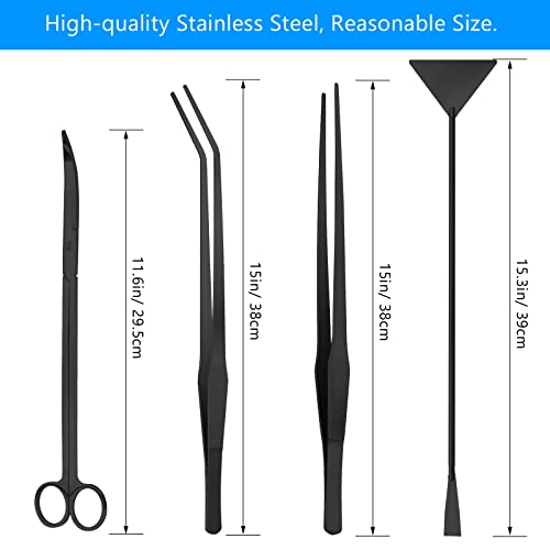 4 in 1 Aquascape Instruments Kits: Aquarium tank aquascape instruments kits together with 1*11.6″ curved scissors, 1*15″ straight tweezers, 1*15″ curved tweezers, 1*15.3″ sand spatula, one package,