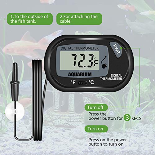 【Steps for Utilization】 First press the PWR button of the reptile thermometer; then put the sensor probe into the water; the hooked up suction cup can stick the LCD display to the aspect of the aquarium.