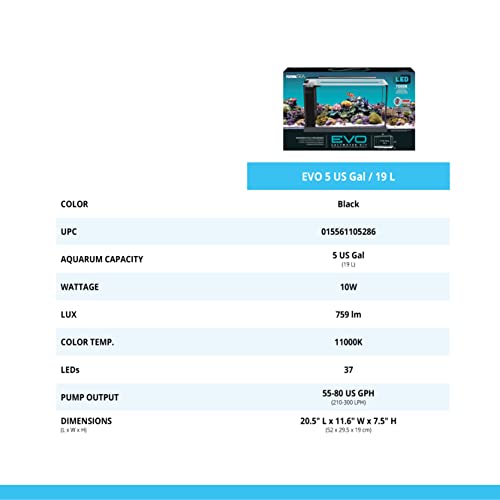 The 5 gallon (19 L) fish tank is 20.5 L x 11.6 W x 7.5 H inches (52 x 29.5 x 19 cm); Wattage: 10 W; Lumens: 759 lm