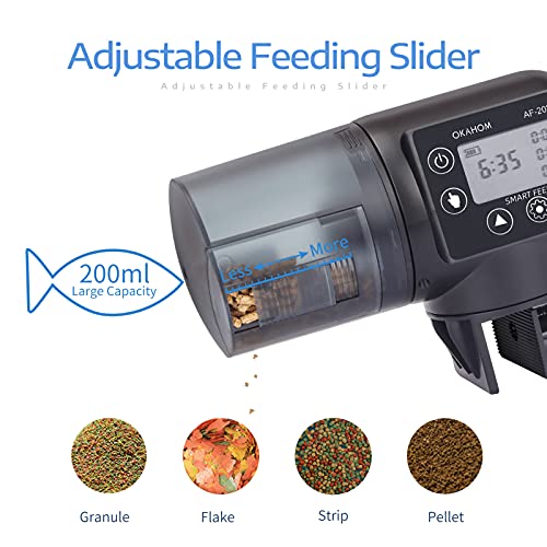 Simply Management Fish Meals Quantity – Open and adjustable designed lid on the highest of fish feeder, letting you simply including and management the quantity for every feeding, and fiting number of flakes, strips, powder and granules fish meals.