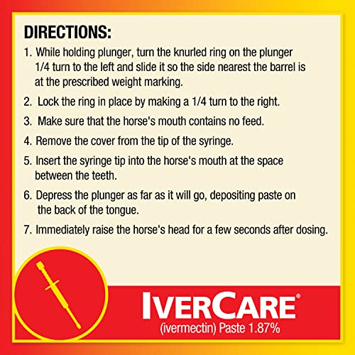 Take away worms and bots with a single dose of IverCare (ivermectin paste) 1.87%. This handy paste provides broad-spectrum parasite management and comes within the prolonged Positive-Grip syringe. It’s the one ivermectin product that treats horses as much as 1,500 kilos in a single dose. IverCare is purple apple flavored and proudly made within the USA with US and imported components. All horses ought to be included in an everyday parasite management program with explicit consideration being paid to mares, foals and yearlings. Foals ought to be handled initially at 6 to eight weeks of age, and routine remedy repeated as applicable. Seek the advice of your veterinarian for a management program to satisfy your particular wants. IverCare (ivermectin) Paste 1.87% successfully controls gastrointestinal nematodes and bots of horses. Common remedy will scale back the probabilities of verminous arteritis brought on by Strongylus vulgaris. Well known because the chief in high quality horse care merchandise, Farnam provides an ever-expanding vary of equine necessities and has been your companion in horse look after over 75 years.
