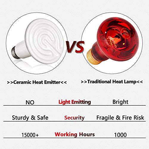 BOEESPAT reptile ceramic warmth lamp emits pure warmth with none gentle, so it will not disturb the sleep of reptiles or pets. Adopted materials into ceramic uncooked supplies, thermal effectivity could be as much as 99%.