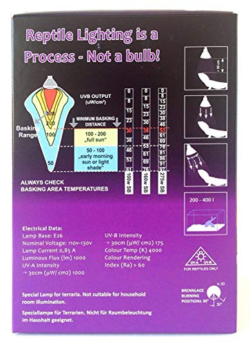 100 Watt Bulb – MINIMUM distance setting of 12″ will produce roughly 150-200 microwatts per sq. centimeter(uW/cm2) of UVB and 900-1200uW/cm2 of UVA. MAXIMUM distance setting of 20″ will produce 50-70 microwatts per sq. centimeter (uW/cm2) of UVB. (Distnace us measured from lamp face to basking spot or reptile for optimum UVB and warmth.)