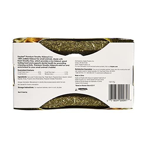 Kaytee premium timothy hideout is a 100% edible hideout for Small animals. Made with contemporary timothy hay this hideout not solely gives a spot in your Small animal to cover but in addition a fantastic tasting deal with which helps dental well being by encouraging chewing exercise. Premium timothy hideouts add enjoyable and enrichment to your Small animal’s habitat. For optimum freshness, retailer in a cool, dry place. Excellent for hamsters gerbils and mice.